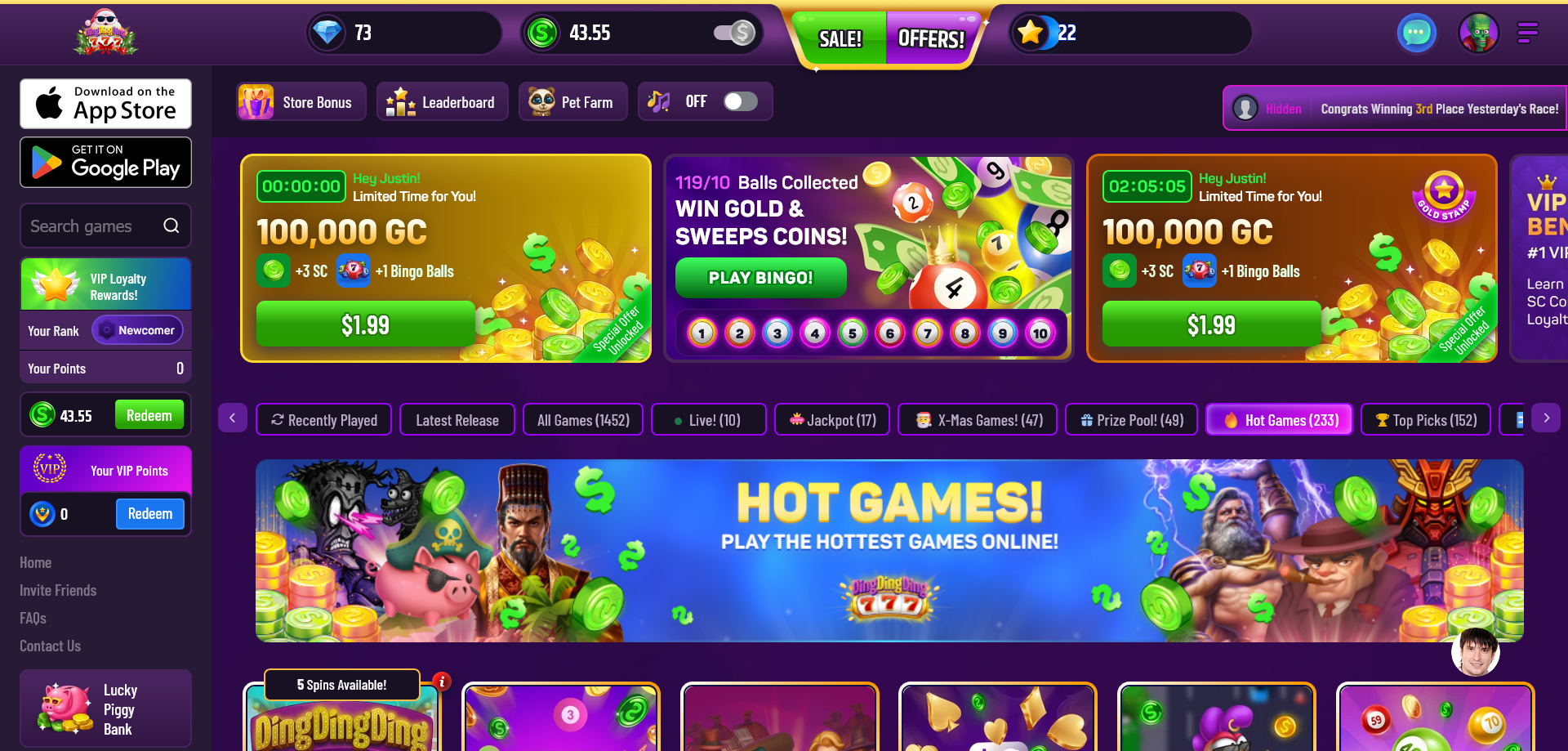 ディン・ディン・ディン は、リアルマネーのリスクを負うことなく、様々な無料ゲームをプレイできるソーシャルカジノプラットフォームです。と ディン・ディン・ディン, このゲームでは、臨場感あふれるゲーム体験を楽しみ、友達と競い合い、エキサイティングな賞品を獲得することができます。.